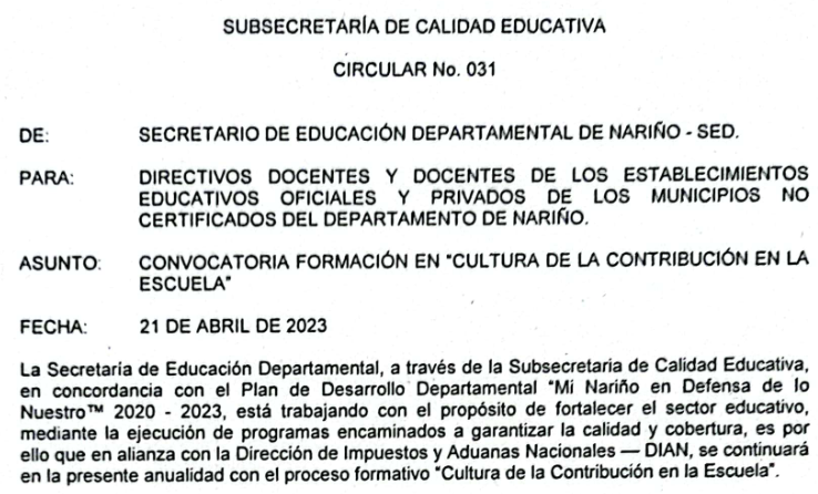 La Secretaría de Educación Departamental de Nariño, en articulación con la Dirección de Impuestos y Aduanas Nacionales – DIAN, continuarán en la presente anualidad con el proceso formativo “Cultura de la Contribución en la escuela”, estrategia pedagógica que busca fortalecer conceptos y prácticas asociadas a la formación en valores, ciudadanía y contribución, dirigido a docentes y directivos docentes de establecimientos educativos públicos y privados.