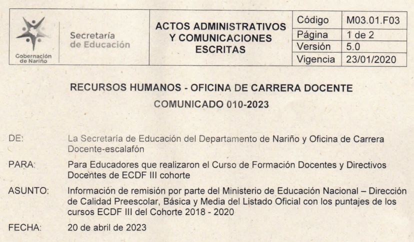 Información de remisión por parte del Ministerio de Educación Nacional – Dirección de Calidad Preescolar, Básica y Media del Listado Oficial con los puntajes de los cursos ECDF III del Cohorte 2018 - 2020, es importante que, los educadores que hayan radicado las certificaciones de las Universidades donde realizaron el curso que no corresponden a los porcentajes establecidos en la ley y en los listados oficiales, deberán volver a radicar con el porcentaje correcto.