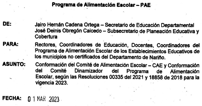 Asunto: Conformación del Comité de Alimentación Escolar - CAE y Conformación del Comité Dinamizador del Programa de Alimentación Escolar, según las Resoluciones 00335 del 2021 y 18858 de 2018 para la vigencia 2023
