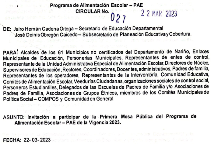 Circular No. 027 - Programa de Alimentación Escolar - PAE