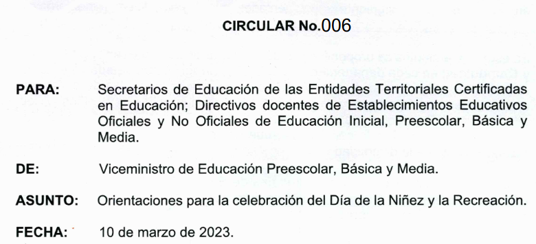 Circular 006 del 10 de marzo de 2023 - Orientaciones para la celebración Día de la Niñes y la Recreación