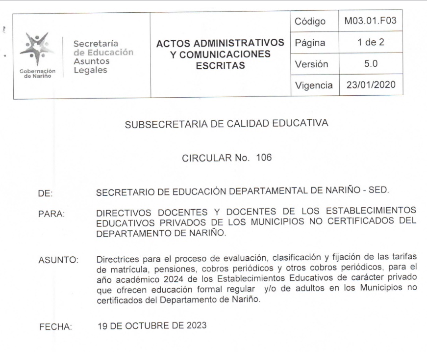 CIRCULAR No. 106 de octubre 19 de 2023: Directrices para el proceso de evaluación, clasificación y fijación de las tarifas de matrícula, pensiones, cobros periódicos y otros cobros periódicos, para el año académico 2024 de los Establecimientos Educativos de carácter privado que ofrecen educación formal regular y/o de adultos en los Municipios no certificados del Departamento de Nariño.