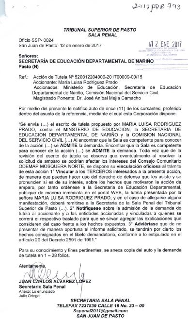 TERCERO.- ORDENAR a las entidades accionadas, que en el término de 24 horas siguientes a la notificación de éste proveído, procedan a publicar en las respectivas páginas web institucionales, la existencia de la presente acción de tutela, para efectos de garantizar intereses de terceros que hayan participado en la convocatoria Docente 253 de 2013 (SIC). Se aclara, por parte, de ésta Secretaria, que la convocatoria que hace referencia la acción de tutela en referencia es la 238 de 2012….” Lo anterior para que los integrantes de la misma se notifiquen y ejerzan su derecho de defensa, ante el Tribunal Administrativo de Nariño, Magistrado Ponente, doctor ALVARO MONTENEGRO CALVACHY, correo electrónico: Esta dirección de correo electrónico está protegida contra spambots. Usted necesita tener Javascript activado para poder verla. .