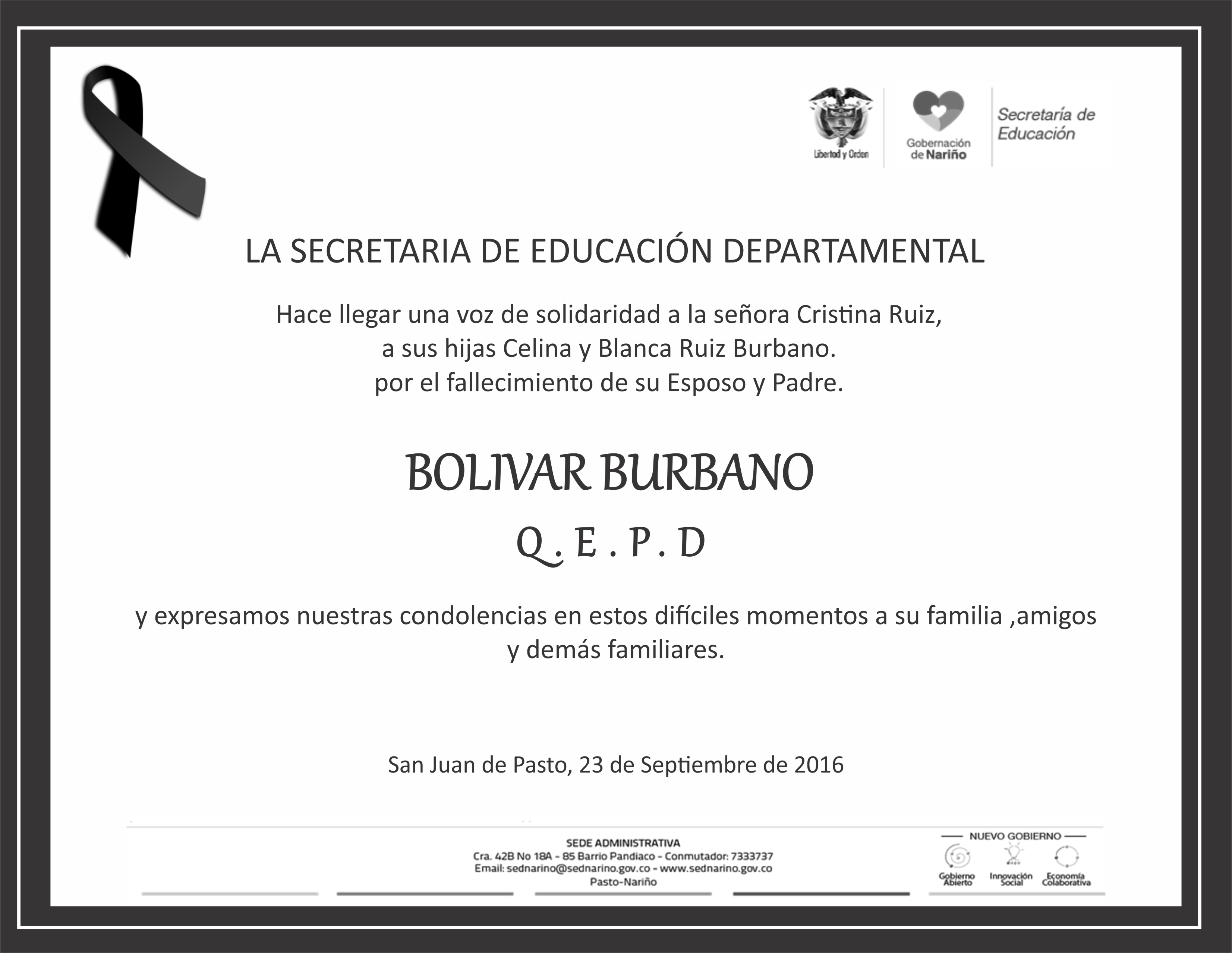 CONDOLENCIAS POR EL FALLECIMIENTO DEL SEÑOR BOLÍVAR BURBANO