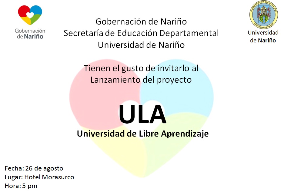 Este viernes, 26 de agosto, la Gobernación de Nariño, a través de la Secretaría de Educación Departamental de Nariño y la Universidad de Nariño, realizará el lanzamiento oficial del proyecto ULA (Universidad del Libre Aprendizaje).