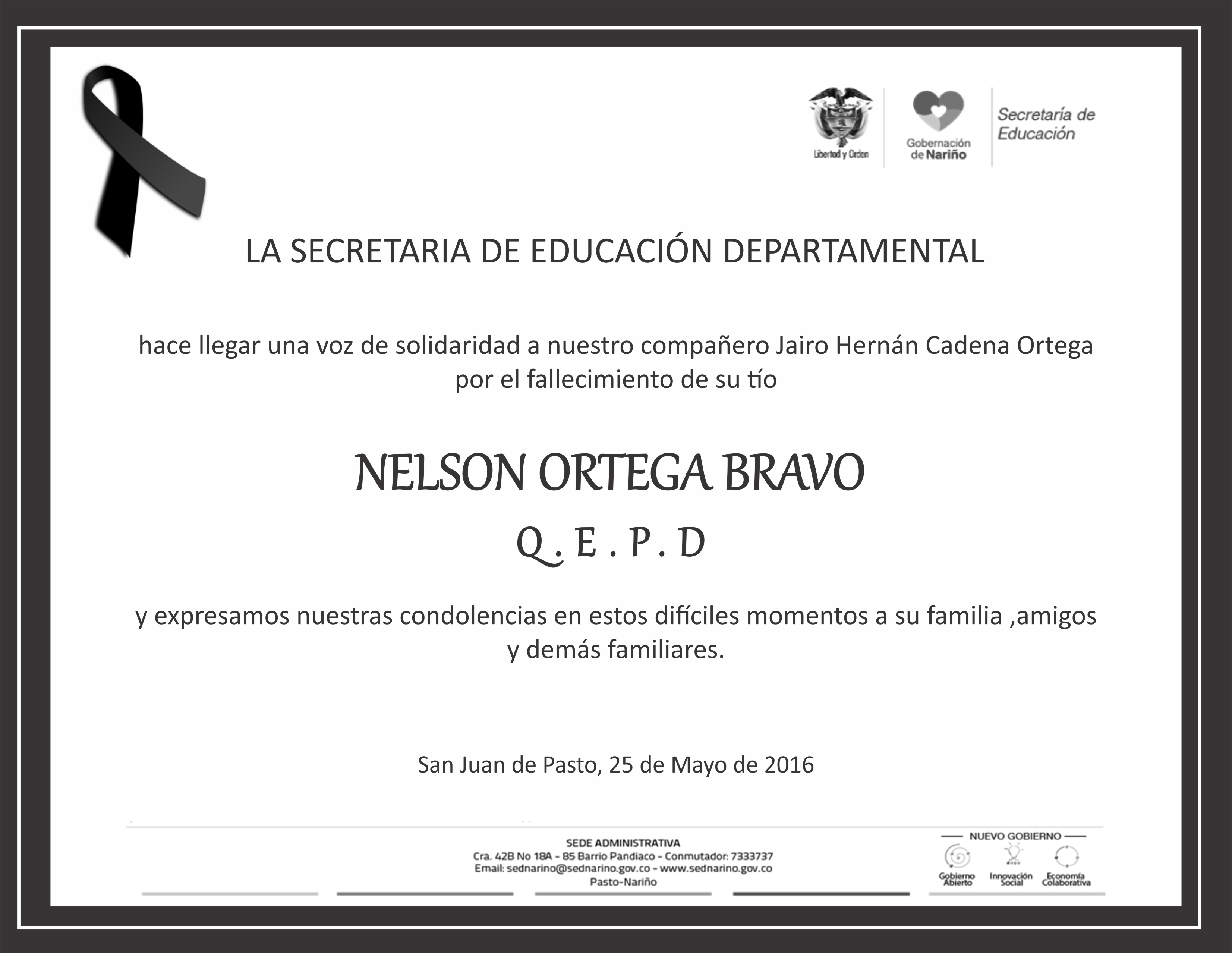 CONDOLENCIAS POR EL SEÑOR NELSON ORTEGA BRAVO