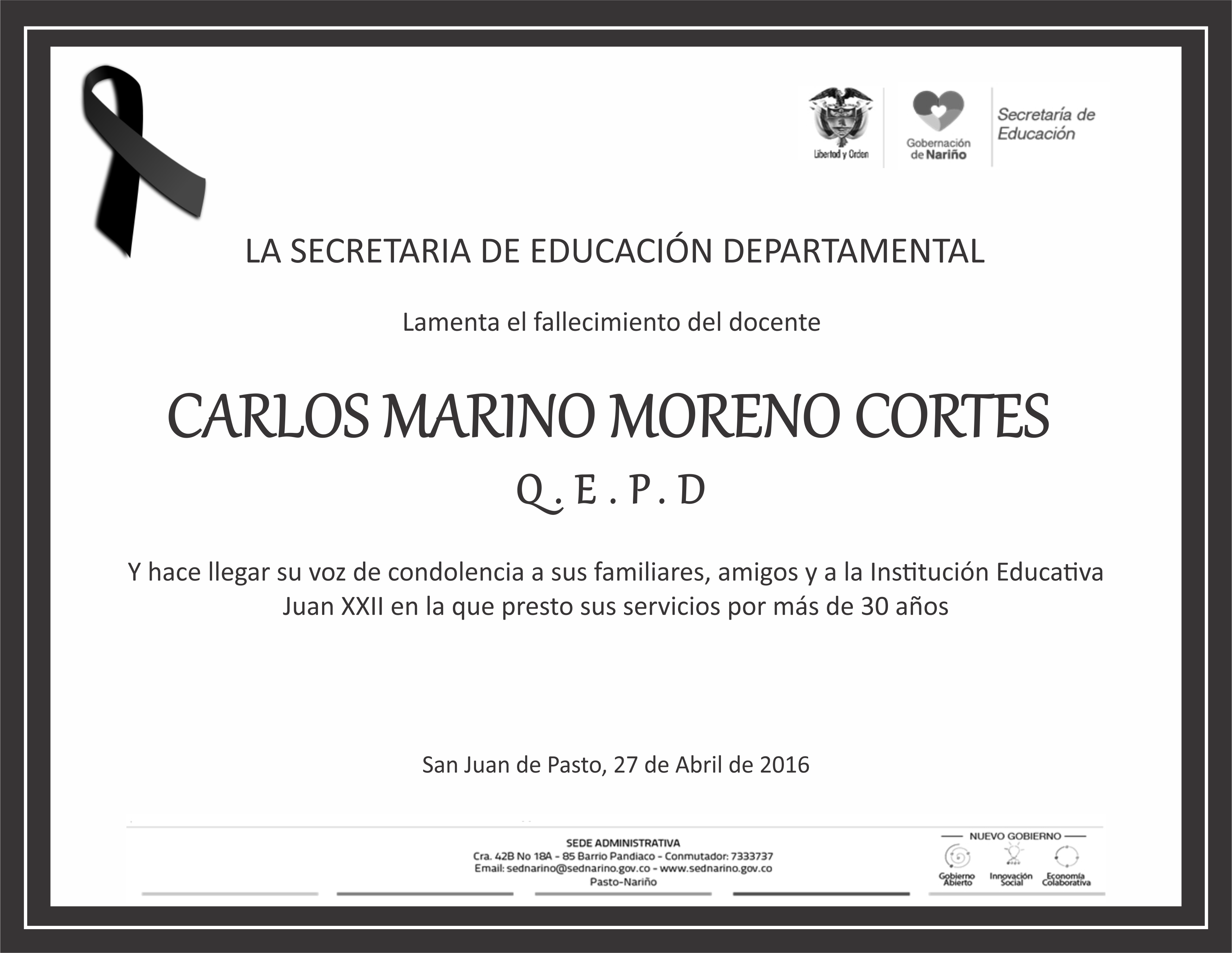 MENSAJE DE CONDOLENCIA POR EL FALLECIMIENTO DEL DOCENTE CARLOS MARINO MORENO CORTES