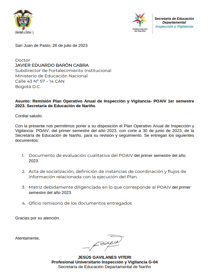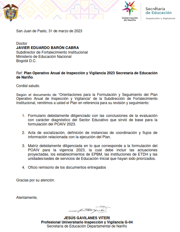 El Plan Operativo Anual de Inspección y Vigilancia (POAIV) es el conjunto de acciones debidamente estructuradas y coordinadas entre el Ministerio de Educación Nacional (MEN), el Departamento de Nariño, los municipios no certificados y los establecimientos educativos con el fin de ejercer un control sobre las instituciones Educativas Departamentales (IED), colegios privados, instituciones de Educación para el Trabajo y el Desarrollo Humano (IETDH) y Asociaciones de Padres de Familia
