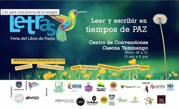 La escritura y la lectura en tiempos de paz es el tema principal de esta Feria, que abrirá sus puertas desde mañana, 26 de mayo, en las instalaciones del Centro de convenciones Casona Taminango. La entrada a este evento es gratuita.