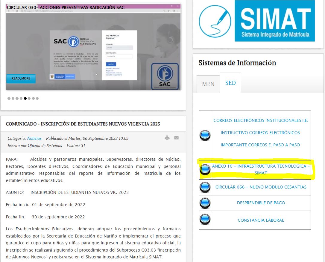 CIRCULAR No. 056 - INFRAESTRUCTURA TECNOLÓGICA SEDES EDUCATIVAS OFICIALES ACTUALIZACIÓN INFORMACIÓN ANEXO 10 _SIMAT