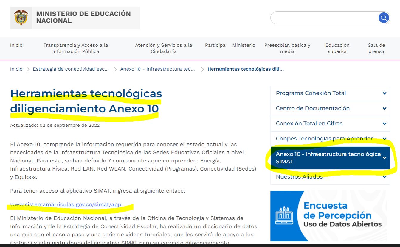 ASUNTO: INFRAESTRUCTURA TECNOLÓGICA SEDES EDUCATIVAS OFICIALES ACTUALIZACIÓN INFORMACIÓN ANEXO 10 _SIMAT