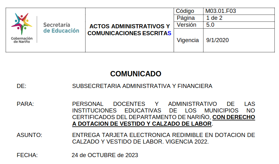 Comunicado - Entrega tarjeta electrónica redimible en dotación de calzado y vestido de labor - Vigencia 2022