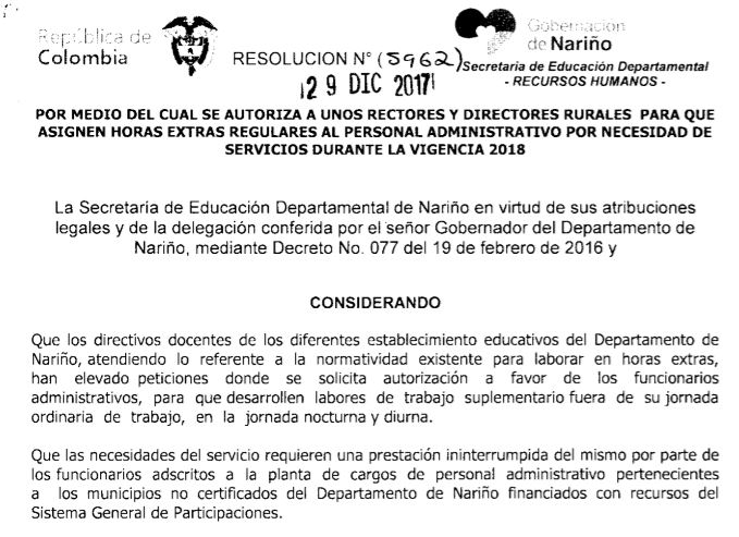 Descargue: Resolución 5962 (Horas Extras Administrativos 2018)