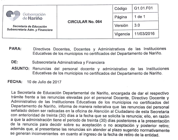 CUMPLIMIENTO CIRCULAR 064 - RENUNCIA DEL PERSONAL DOCENTE Y ADMINISTRATIVO IE - SED