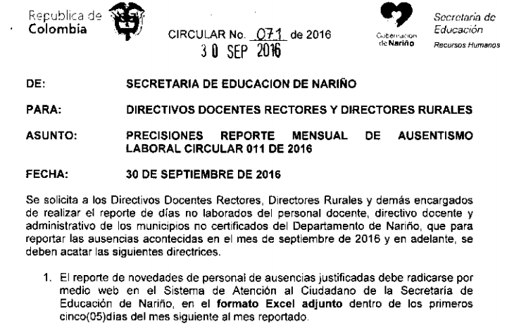Descargue: CIRCULAR No 071-2016 Precisiones Ausentismo Laboral SED Nariño.