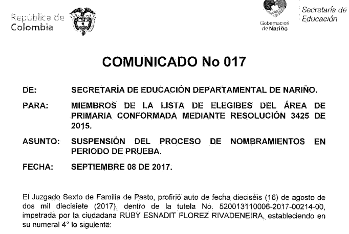 PARA: Docentes, Directivos docentes y personal administrativo de Instituciones Educativas del Departamento de Narino y de los Municipios certificados de Pasto – Ipiales y Túmaco.