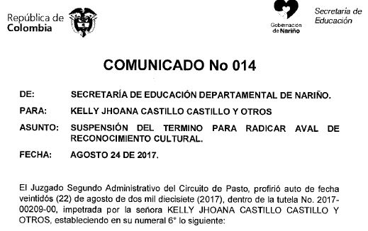 - Comunicado 012, Auto Admisorio y Tutela