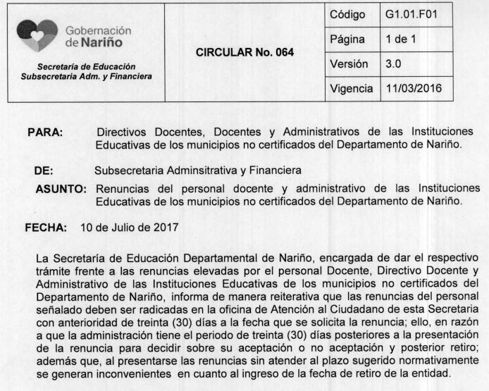 Descargue: CIRCULAR 064 RENUNCIA DEL PERSONAL SED