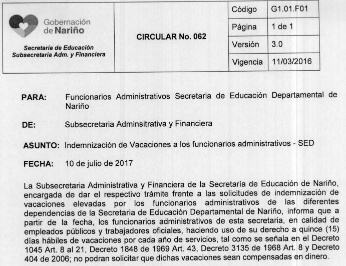 CIRCULAR 062 - INDEMNIZACIÓN DE VACACIONES DE ADMINISTRATIVOS SED