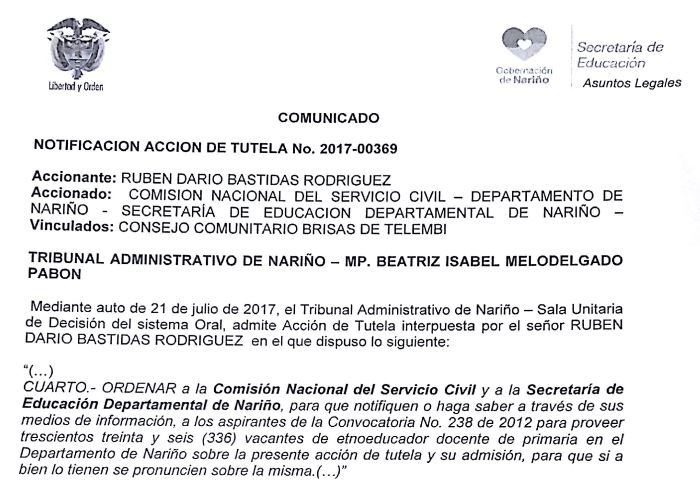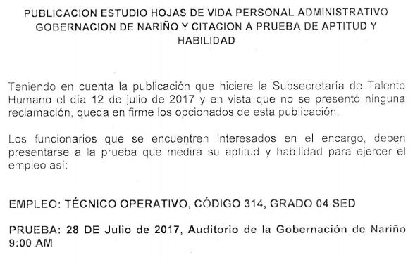 PUBLICACIÓN ESTUDIO HOJAS DE VIDA PERSONAL ADMINISTRATIVO GOBERNACIÓN DE NARIÑO Y CITACIÓN PRUEBA DE APTITUD Y HABILIDAD.