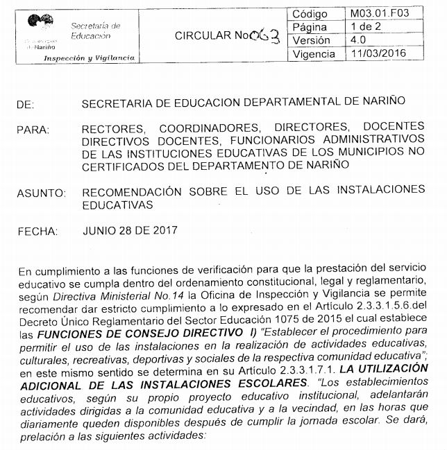CIRCULAR 063 - RECOMENDACIÓN SOBRE EL USO DE LAS INSTALACIONES EDUCATIVAS.