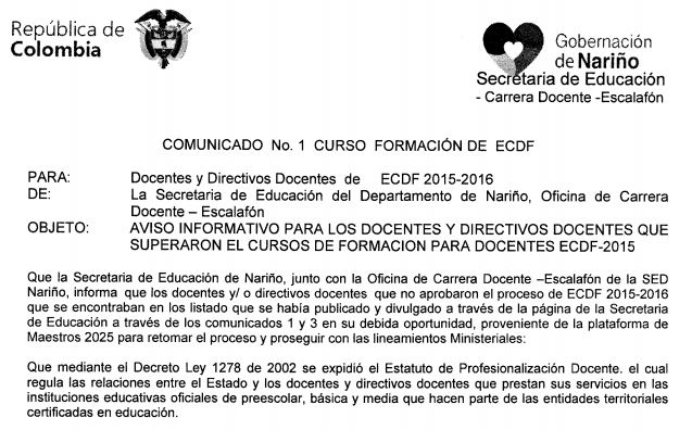 Aviso informativo para los Docentes y Directivos Docentes que superaron el curso de formación para Docentes ECDF 2015 – 2016.
