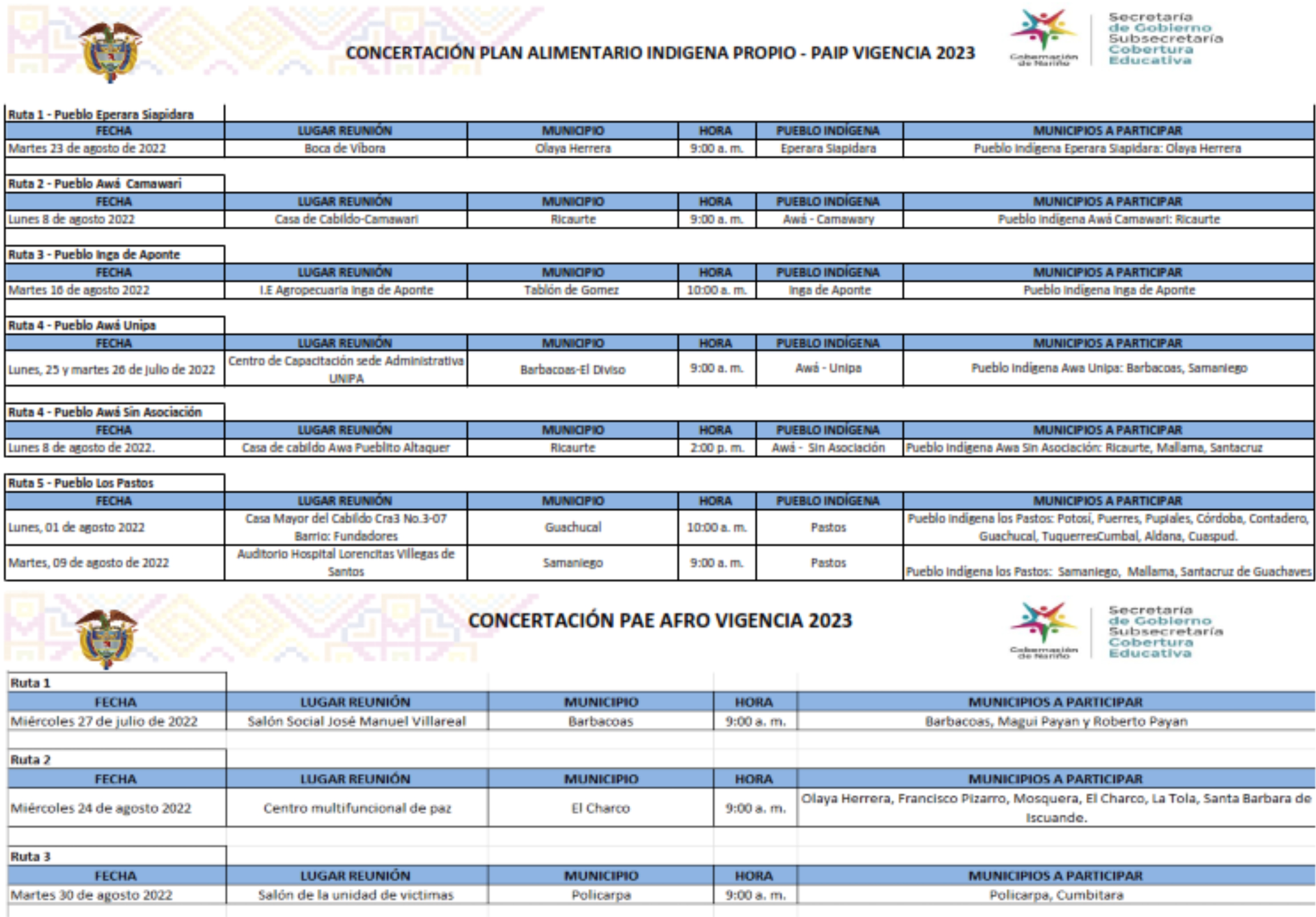 La secretaría de Educación Departamental de Nariño y la Subsecretaría de Planeación Educativa y Cobertura, a través del Programa de Alimentación Escolar – PAE como estrategia estatal que promueve el acceso con permanencia de niños, niñas y adolescentes de las instituciones educativas oficiales matriculados en el sistema educativo oficial SIMAT mediante el suministro de un complemento alimentario durante la jornada escolar, para impactar de forma positiva los niveles de aprendizaje, disminuir el ausentismo, la deserción y fomentar estilos de vida saludable a la comunidad educativa de los 61 municipios del departamento de Nariño, se permiten hacer público el Cronograma de Concertaciones de Pueblos Indígenas y afrodescendientes, a partir del día 25 de julio del presente.