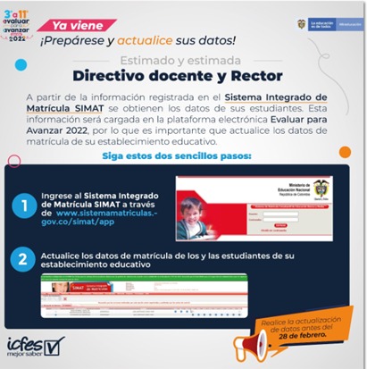"Evaluar Para Avanzar", es una Estrategia del Gobierno Nacional que ofrece a los y las docentes, un conjunto de herramientas para apoyar y acompañar los procesos de enseñanza, seguimiento y fortalecimiento del desarrollo educativo de los niños, niñas y jóvenes en todo el país. Nariño debemos de implementar esta estrategia con el fin de lograr mejores resultados en nuestro quehacer pedagógico. Por lo tanto los invitamos a registrar a sus estudiantes en la Plataforma Prisma, con el fin de que no pierdan esta oportunidad.