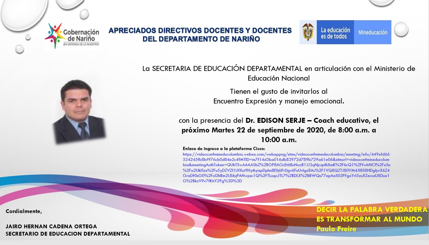 Reciban un cordial saludo por parte del Ministerio de Educación Nacional y de la Secretaría de Educación Departamental.