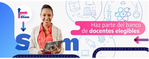 A partir de la información compartida desde el 17 de septiembre, el Ministerio TIC, el Ministerio de Educación Nacional y Computadores para Educar REITERAN la invitación a los docentes de nuestra entidad territorial a participar en la convocatoria para conformar el Banco de Elegibles de docentes del proyecto Rutas STEM , la convocatoria busca que los docentes desarrollen habilidades en el enfoque educativo (Ciencias, Tecnologías, Ingeniería, Matemáticas), estrategia de gobierno que tiene como propósito formar a los docentes e inspirar a estudiantes y comunidad en general del país, para que desarrollen competencias del siglo XXI y se acerquen a la ciencia y la tecnología, elementos esenciales para responder a las demandas de la cuarta revolución industrial.