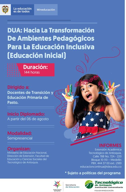 - La Convocatoria, cuenta con tres líneas de formación, para el Departamento de Nariño, le corresponde la Línea No. 1 Actualización Pedagógica, en el cual se contempla el DIPLOMADO – DUA: Hacia la transformación de ambientes pedagógicos para la educación inclusiva (Educación Inicial). Revisar adjunto (texto convocatoria).