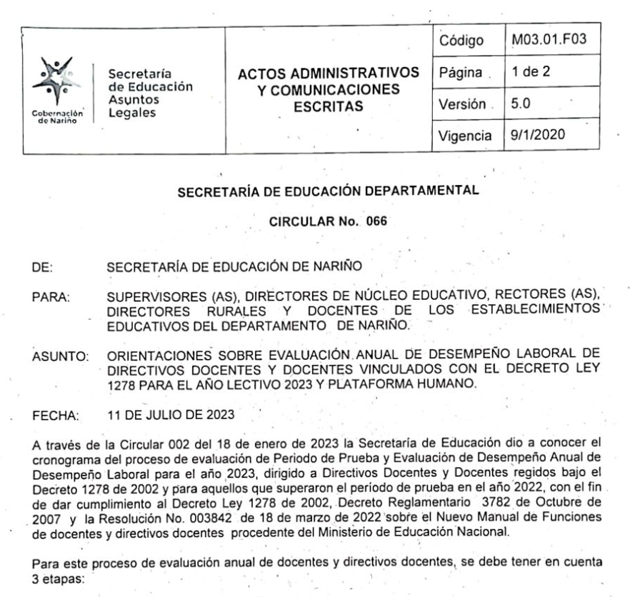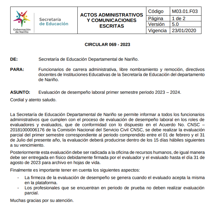 Circular 069 EVALUACIÓN DE DESEMPEÑO