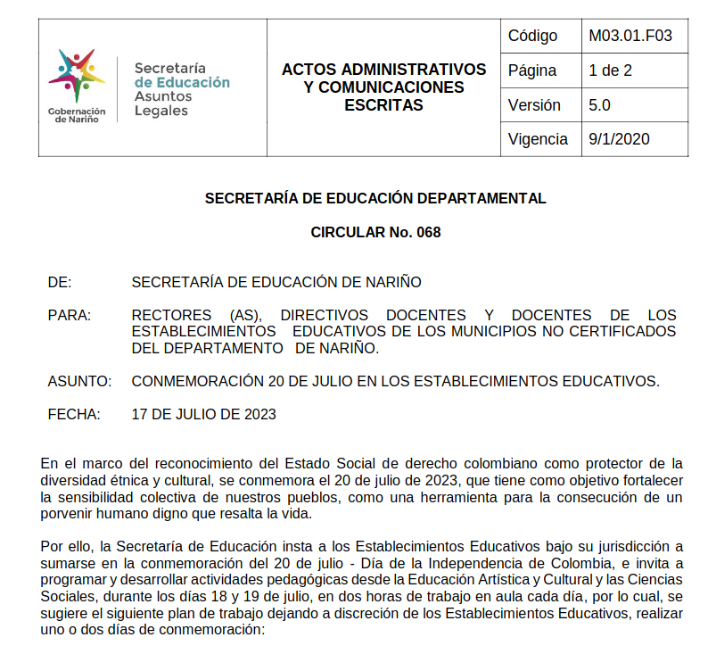 Circular Nro. 068 - Conmemoración 20 de Julio en los Establecimientos Educativos del País