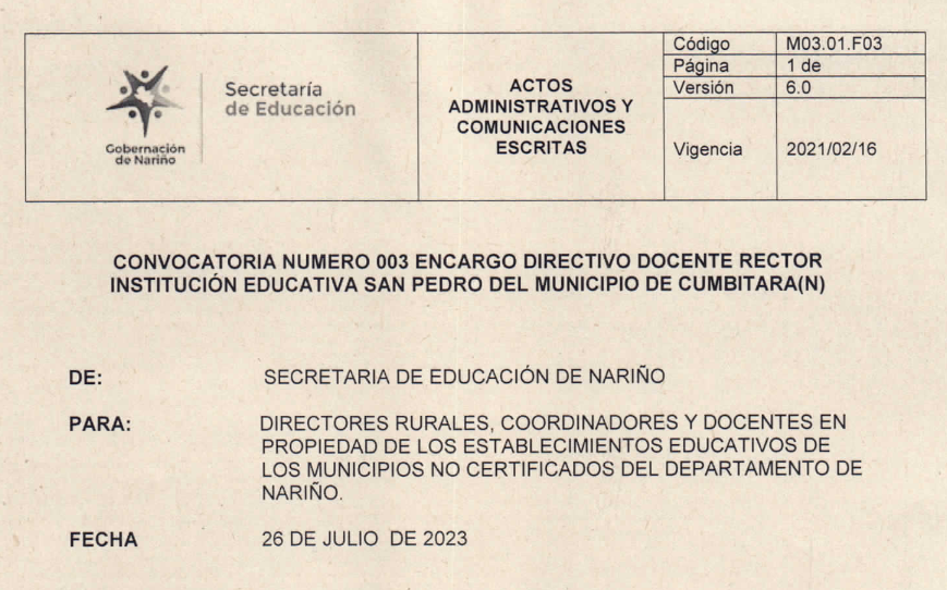 Convocatoria Nro. 003 encargo Directivo Docente Rector Institución Educativa San Pedro del municipio de Cumbitara(N)