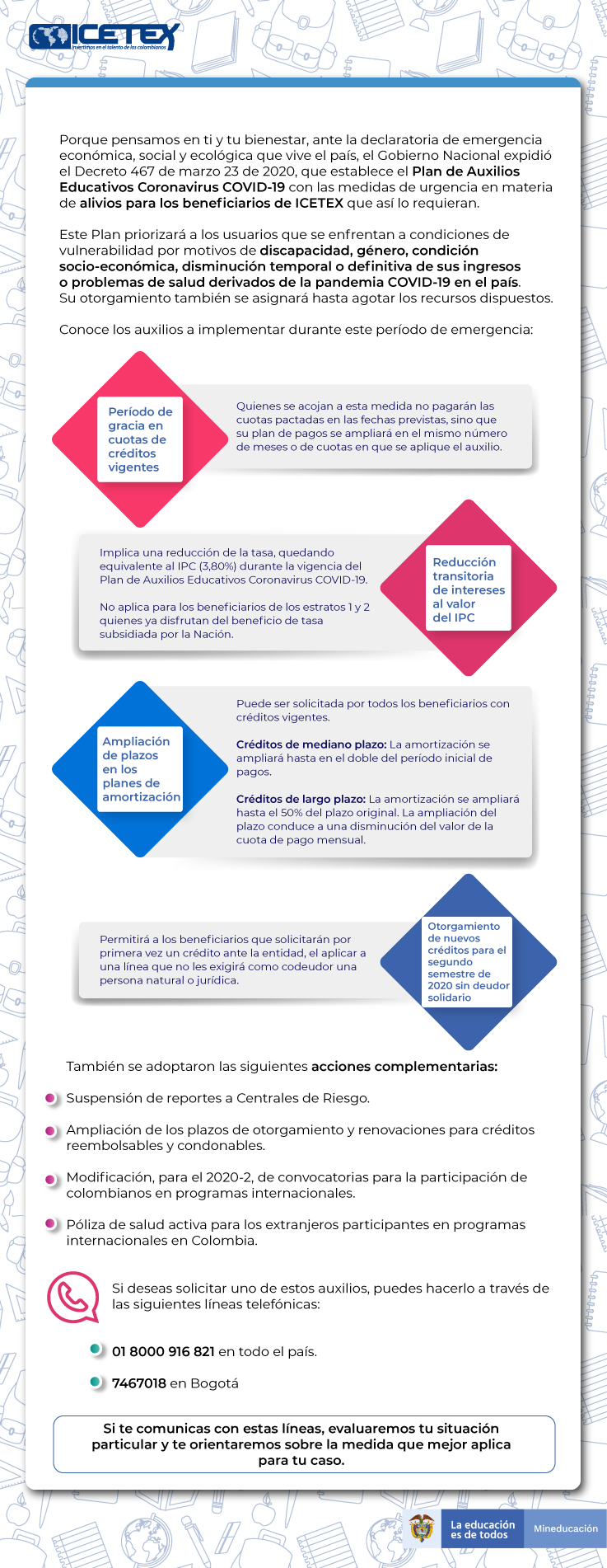 Estas medidas se suman a las adoptadas con la Circular Conjunta número 11 de 9 de marzo de 2020, donde los Ministros de Educación Nacional y de Salud y Protección Social, emitieron las recomendaciones para la prevención, manejo y control en el entorno educativo de la infección respiratoria aguda por Coronavirus, y la Circular número 19 del 14 de marzo de 2020, con la que se comunican medidas alrededor de estrategias de apoyo para los procesos de aprendizaje y planeación educativa, preparando la respuesta del sistema educativo, con estrategias flexibles.