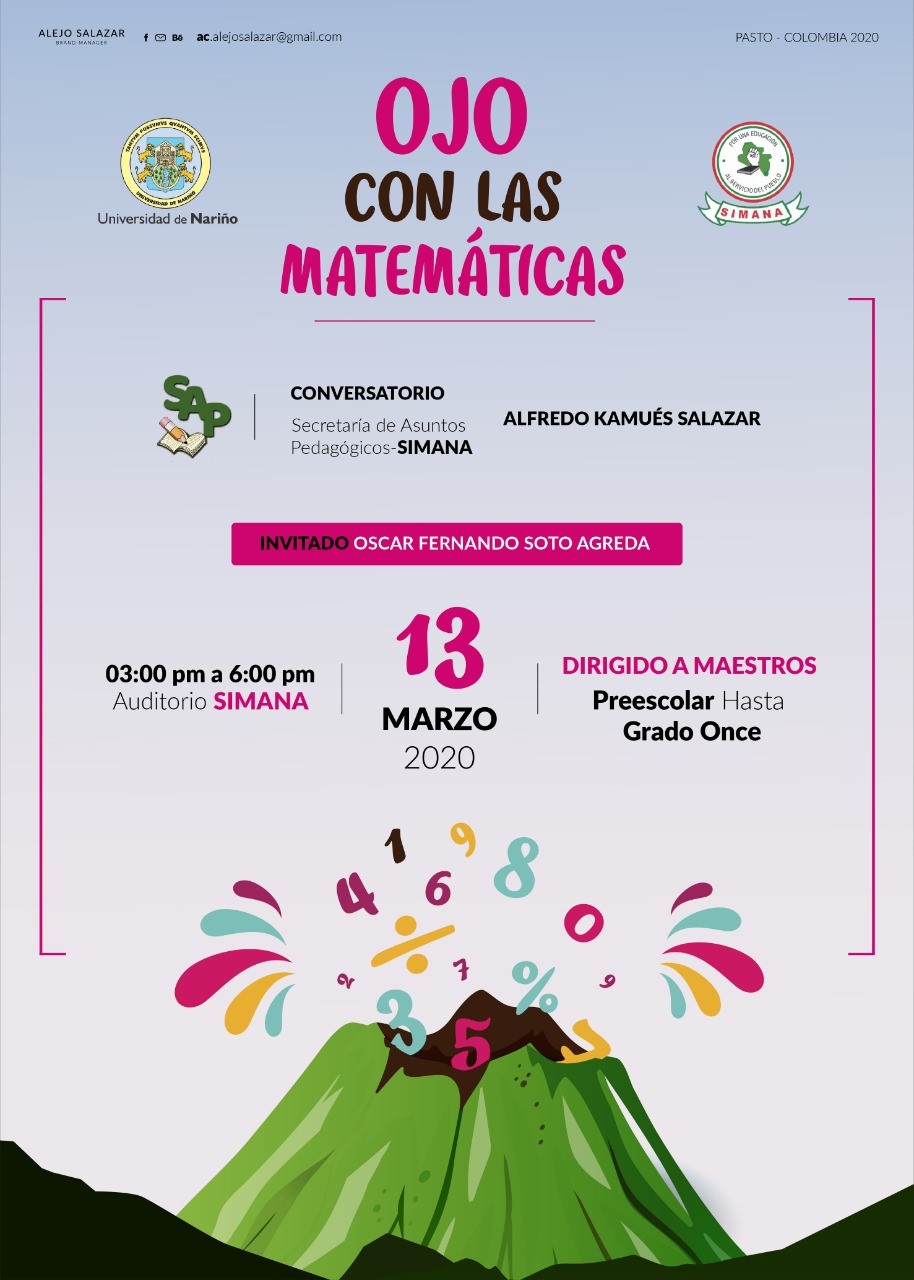 El compromiso académico celebrado entre el Departamento de Matemáticas de la Universidad de Nariño y Simana, hace re apertura de los CONSERVATORIOS DE MATEMÁTICAS con la charla OJO CON LAS MATEMÁTICAS, título sugerido por nuestro amigo común Álvaro León Perico.