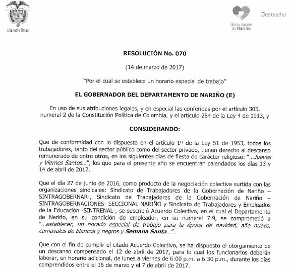 RESOLUCION 070 - (HORARIO ESPECIAL SEMANA SANTA)