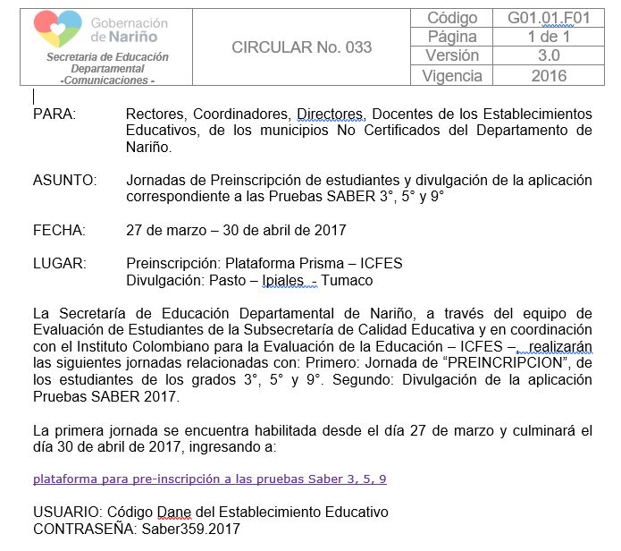 Descargue: Circular 033 - (Preinscripción Plataforma Prisma - ICFES)