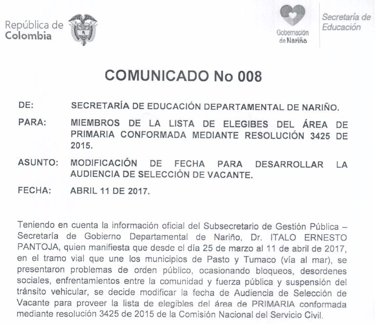 COMUNICADO 008 - 2017 MODIFICACION DE FECHA PARA DESARROLLAR LA AUDIENCIA DE SELECCION DE VACANTE